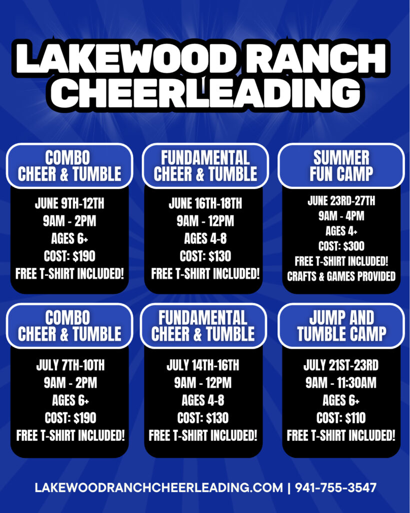 Sign up for one or more of our skill building camps at Lakewood Ranch Cheerleading. We have something for everyone! No experience necessary. Summer camps are a great way to get introduced to cheerleading, gain confidence, make new friends and learn a lot! And if you are interested in just having fun, sign up for our week long summer fun day camp! Campers get one free tshirt for the summer when attending a camp. Space is limited! Registration opens March 1st. Click HERE to register.