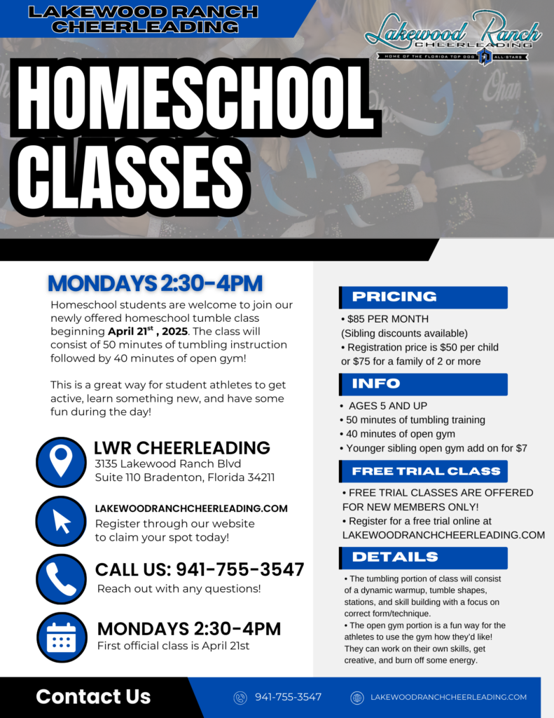 We are excited to offer a homeschool tumble class at Lakewood Ranch Cheerleading. The class includes 50 minutes of fun tumbling instruction followed by 40 minutes of open gym time. This is the perfect way to get that PE credit and have fun! Register online though our parent portal.